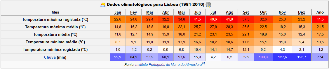Lisboa é uma das capitais mais amenas da Europa, com um clima mediterrânico fortemente influenciado pela Corrente do Golfo. A Primavera é fresca a quente (de 8 °C a 26 °C) com sol e alguns aguaceiros. O Verão é, em geral, quente e seco e temperaturas entre 16 °C a 35 °C. O Outono é ameno e instável, com temperaturas entre 12 °C e 27 °C e o Inverno é tipicamente chuvoso e fresco, também com algum sol (temperaturas entre 3 °C e 17 °C). A temperatura mais baixa registada foi de -1,2 °C e a mais elevada foi de 42,0 °C.65 A temperatura da água do mar varia entre os 15 °C e 16 °C em Fevereiro e entre os 20 °C e 21 °C em Agosto e Setembro, sendo que a média anual é de 17.5 °C. Nas tardes de Verão, o vento tende a soprar moderado (por vezes forte) de noroeste. Pela sua condição geográfica, está entre as capitais europeias com Invernos mais amenos, sendo raras as temperaturas abaixo de zero e bastante esporádica a queda de neve; embora os registos mais recentes datem de 2006 e 2007, podem passar-se muitos anos sem que neve em Lisboa.